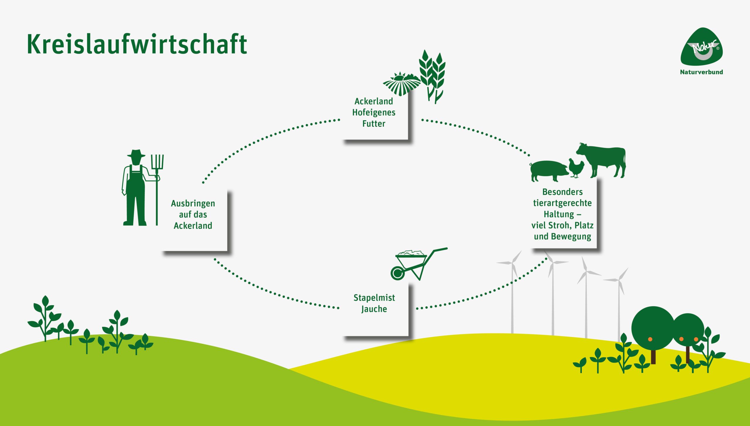 Jeder Naturverbund-Landwirt im Bio- und auch im Natur-Programm hält nur soviel Schweine (max. 14/ha) oder Rinder (2 erwachsene Tiere/ha), dass er den entstehenden organischen Dünger sinnvoll als Pflanzennährstoff einsetzen kann.